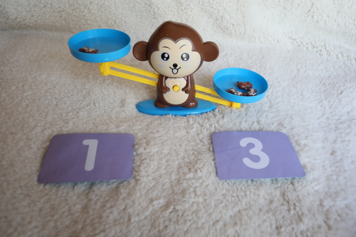 Monkey Number Scale: This game features a monkey scale with monkeys and numbers. Players place a number on one side of the scale and balance it by adding the correct number of monkeys to the other side. The game comes with flashcards, some with just the number on it, and you can use that to pick the number to put on the scale, say the number, then count out the monkeys to make sure you counted correctly and your scale is even across.