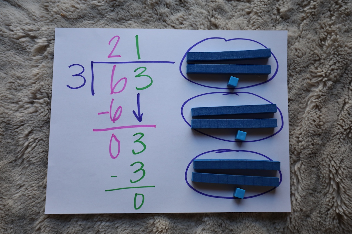 - While performing long division, use number blocks or monopoly money on the side. Use a whiteboard to draw the groups (the number on the outside of the box), and money or blocks to divide (the number on the inside of the box) equally between the groups.